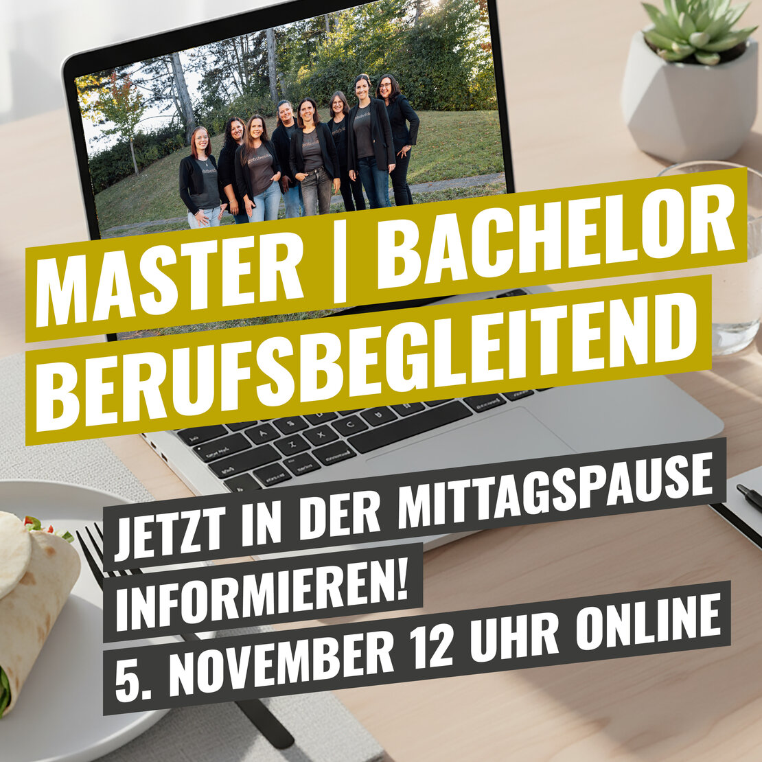 Informieren Sie sich in Ihrer Mittagspause über unser berufsbegleitendes Studienangebot- Bachelor und Master. Individuell und unverbindlich.