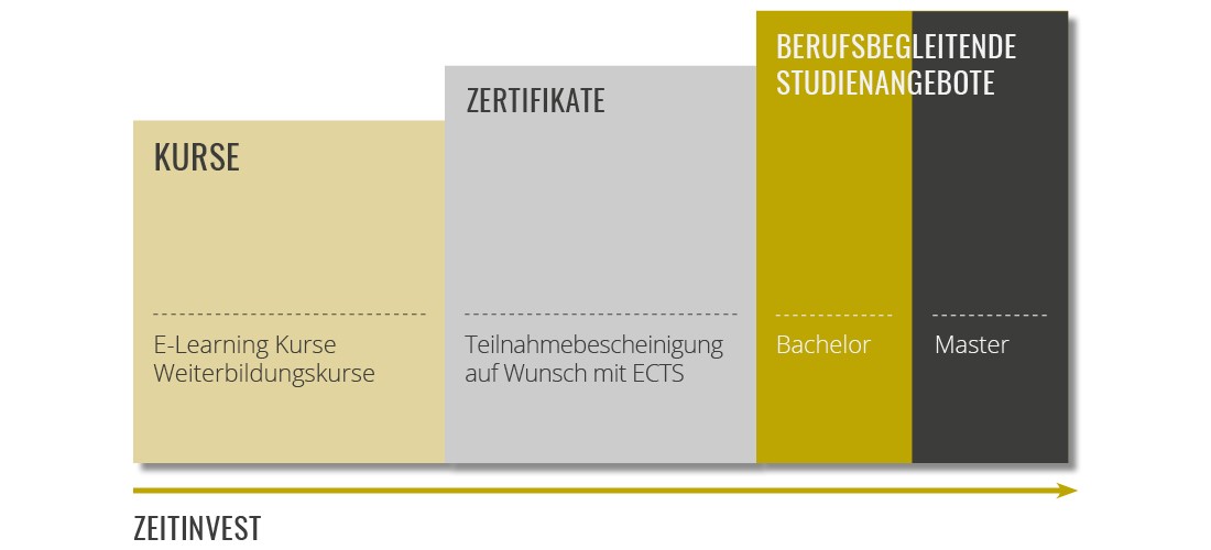 Die Kursformate unseres berufsbegleitenden Weiterbildungsangebots unterscheiden sich nach Tiefe, Umfang, Format und Abschluss. Unser Angebot reicht von kurzen Weiterbildungsformaten bis hin zu berufsbegleitenden Bachelor- und Masterstudiengängen.