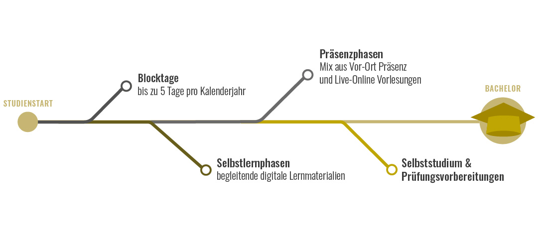 Ein Mix aus vor Ort-Präsenz, Online-Vorlesungen und geleiteten Lerneinheiten, die zu Hause bearbeitet werden können, bietet unseren berufstätigen Studierenden mehr Flexibitität in ihrer Zeiteinteilung. Zudem ermöglicht dieses Konzept eine schnelle Umstellung von Präsenzvorlesungen auf digitale Lehrveranstaltungen.