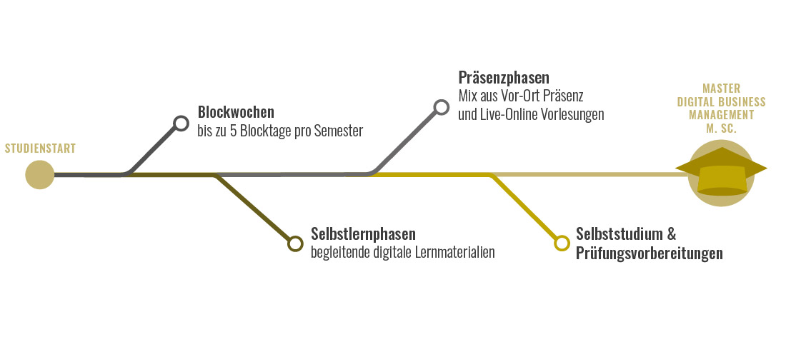 Das Masterstudium ist ein Mix aus Vor-Ort-Präsenz, Online-Vorlesungen und hochwertigen geleiteten digitalen Lerneinheiten, die zu Hause im Selbststudium erarbeitet werden.