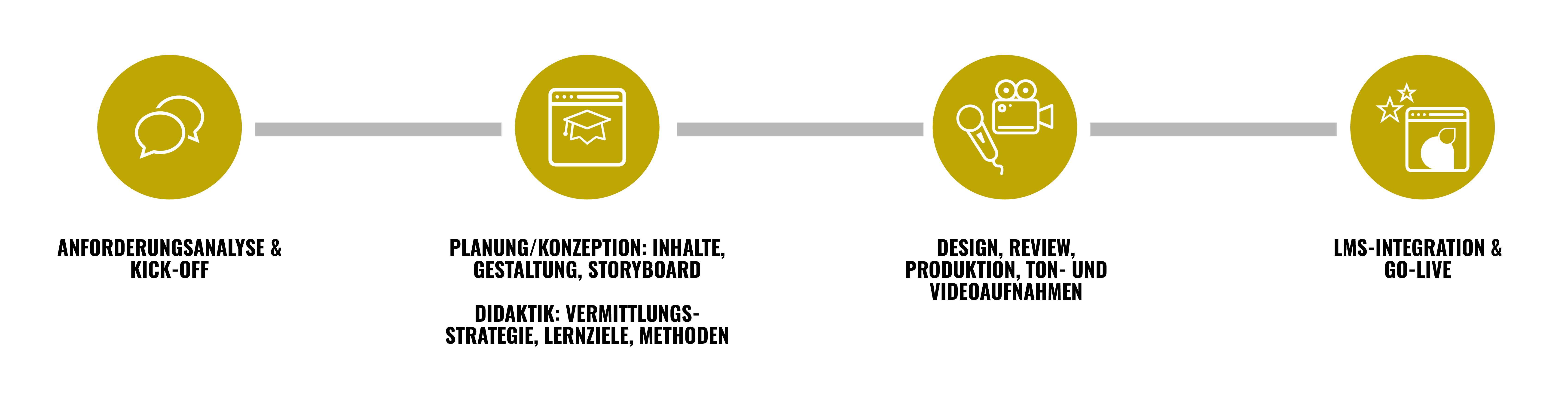Ihre digitale Lernlösung entsteht in vier Schritten: Zunächst analysieren wir Ihre Anforderungen und starten mit einem Kick-off. Darauf folgen Konzeption, Design und Produktion inklusive Tonaufnahmen. Abschließend integrieren wir die Inhalte ins Lern-Management-System und begleiten den Go-live.
